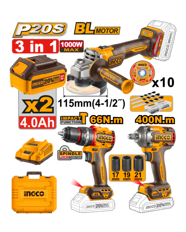 KIT A BATERIA AMOLADORA + TALADRO + LLAVE IMPACTO + ACCESORIOS INGCO