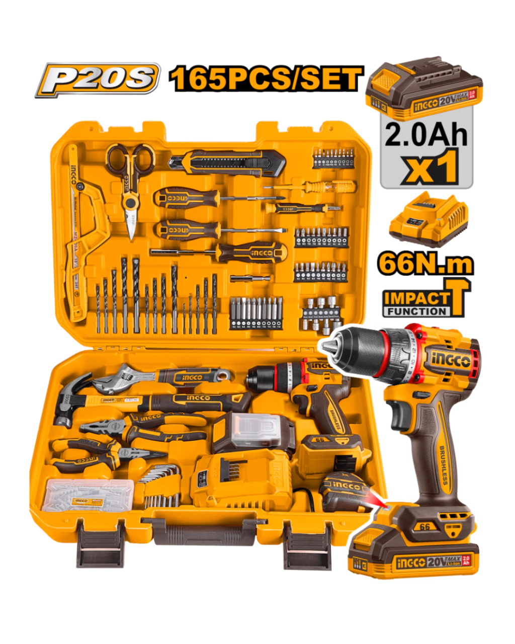 KIT ATORNILLADOR PERCUTOR 20V C/BAT Y CARGADOR + 165 HERRAMIENTAS INGCO